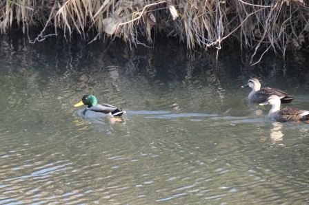 カルガモに交じって珍しいカモがいました。 マガモですね。 この位置にいるのは大変珍しいです。 |