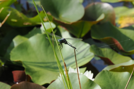 トンボがたくさん飛んでいました。 このトンボは複眼が青い。 光の加減でこのように見えるのかな。 |