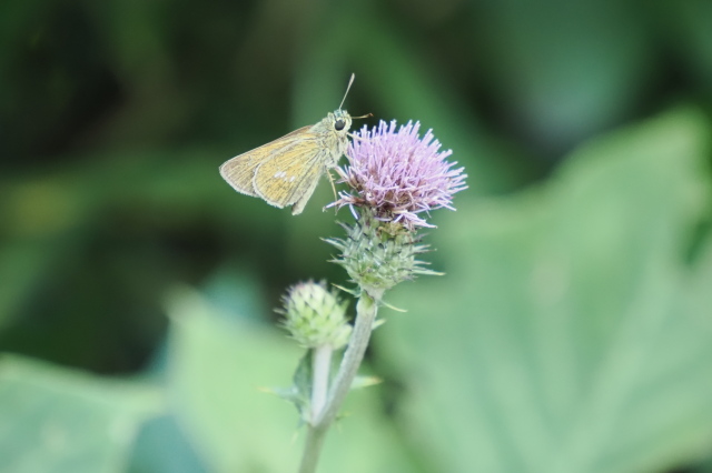 ノアザミが咲き始めました。 セセリチョウも元気です。 このノアザミの花は少し白っぽいです。 |
