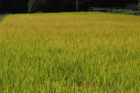 こちらの田んぼはそろそろ稲刈り時期。 稲穂も稲の葉も黄金色。 |
