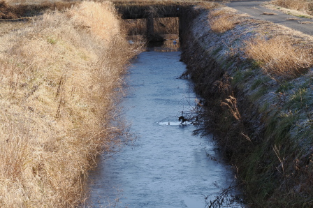 | 用水路も全面凍結。 これではカモたちも泳げませんね。 |