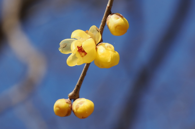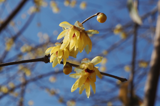 | こちらの蝋梅は花弁がとがっています。 花を比べるのも楽しみの一つ。 相変わらず良い香りです。 |