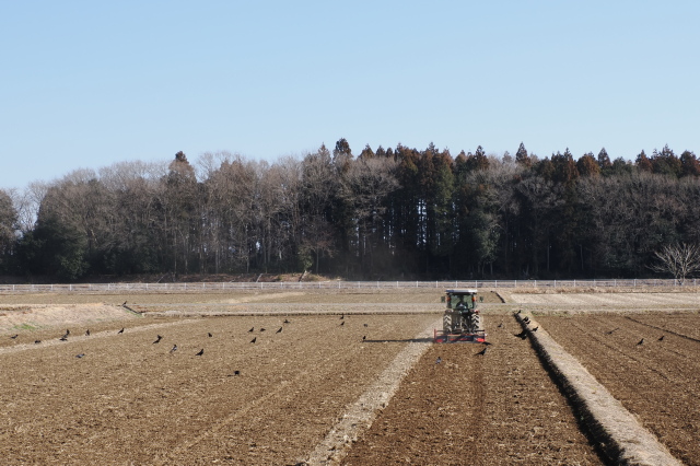 | カラスがたくさん集まっています。 トラクターで土を起こしているので掘り起こされたミミズやカエルを狙っているのかもしれません。 この時期はトラクターが一番モテます。 |