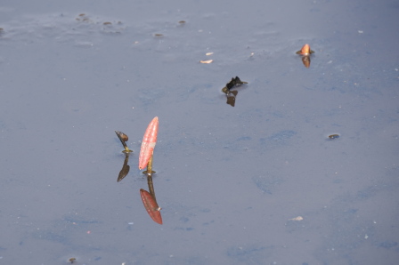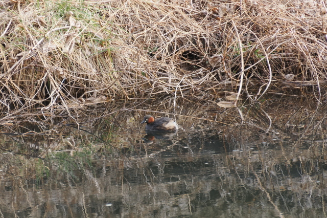 | 今日はカイツブリが見られました。 この水鳥は潜水が得意。 一度潜ってしまうとなかなか浮いてきません。 とんでもないところに浮いてきます…。 |